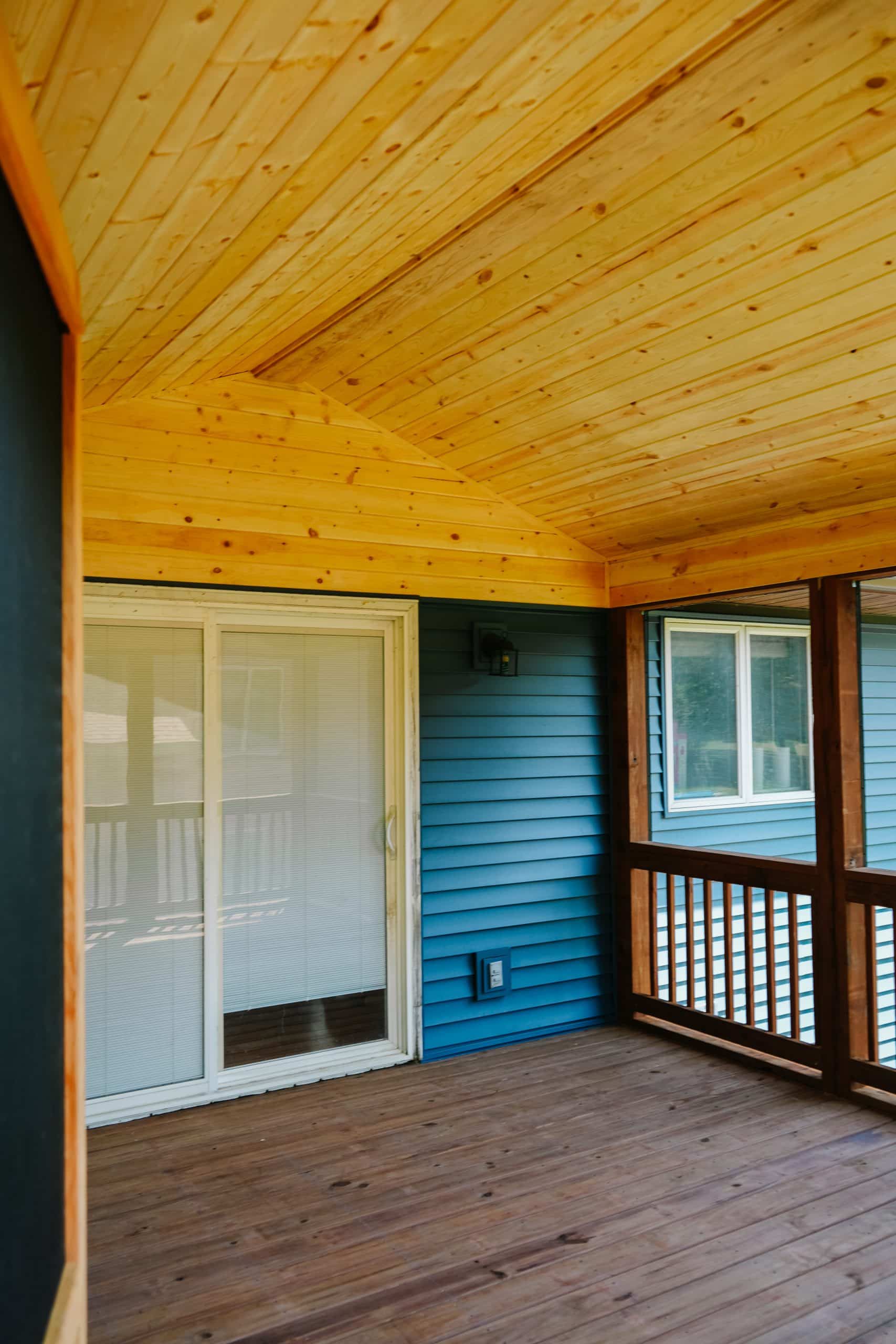 The structure ties seamlessly into the home’s existing exterior, where our team had previously installed Norandex Jamestown Blue siding and GAF Pewter Gray roofing for long-lasting protection. Royal Brown soffit, fascia, and drip edge complete the polished look, while the porch itself features warm pine ceilings, durable screened panels, and rich wood framing.